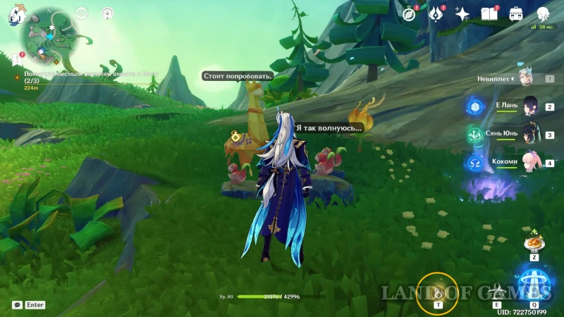 Отправляйтесь на север Леса Благословений, к участку, на котором можно отыскать одно из 15-и Перьев веселья (в отдельном гайде мы отметили его под номером 14): на полянке под древом с синей листвой мы подслушаем разговор белок-летяг, которые наставляют свою молодежь на прохождение испытания трех гор.