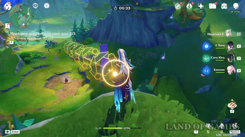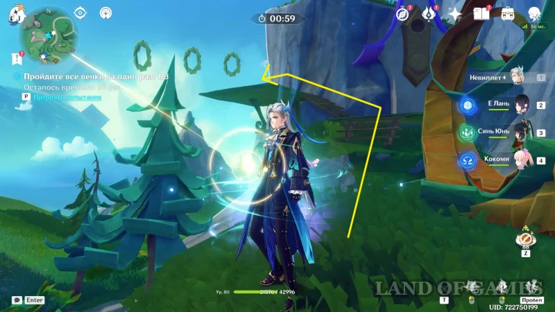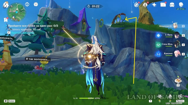 Далее поднимаемся на ближайшую скалу (перед вами будет голубоватый дымок, который увеличит высоту прыжка) и встаем так, чтобы летяга при возвращении прошла через еще 3 веночка (белка не вернется, пока вы не нажмете клавишу базовой атаки).