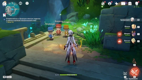 Далее переместитесь к телепорту в Кур-де-Фонтейн, расположенному неподалеку от Катерины. Пройдите к лавке алхимика и справа от нее вы услышите голоса игрушек. Судя по всему, они решили исследовав внешний мир, начав с Гидро королевства.