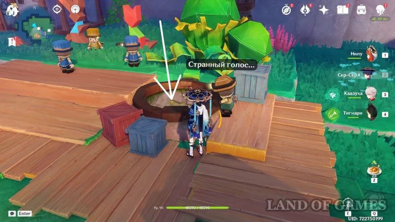 К западу от дворика со вторым конструктором есть толпа игрушечных человечков, наблюдающих за фигурками зайца и кицунэ, но один из них слышит «Странный голос...» и заглядывает в колодец – нам нужно в него спрыгнуть (тут довольно глубоко).