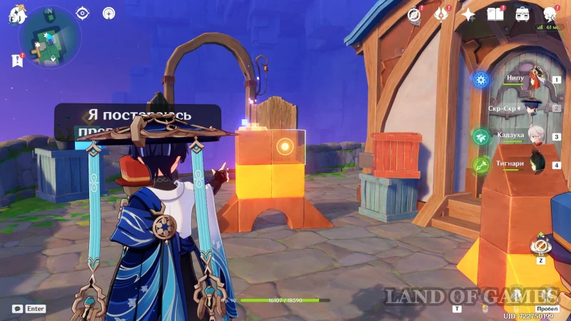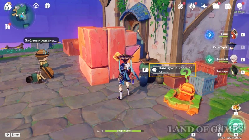 Первый игрушечный конструктор находится напротив телепорта на юге Расколотого моря: у края островка сидят два деревянных человечка, а на голове одного из них лежит желтый треугольник. Подберите пазл и установите его на верх цветной башенки, чтобы разблокировать доступ к богатому сундуку.