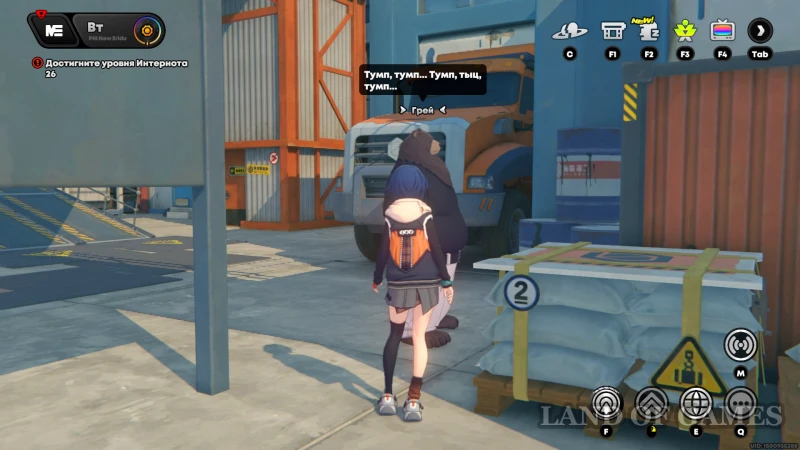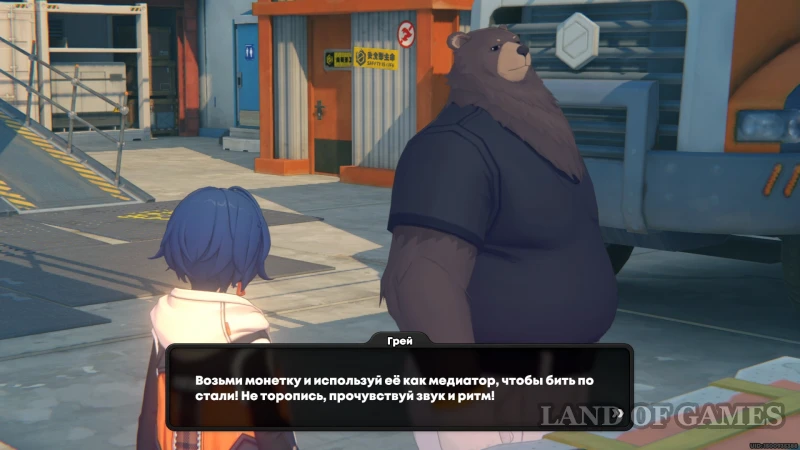 Около оранжевого грузовика, припаркованного близко к закутку с биотуалетами, стоит медведь Грей. В душе он композитор, поэтому в конце разговора вручит жетончик АИК, который посоветует использовать в качестве медиатора.