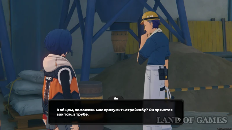 Подойдите к рабочему Яну, что стоит около груды строительного песка за центральной конструкцией. Ему нужно помочь примириться со стройкабу, скрывшимся в одной из длинных белых труб слева.