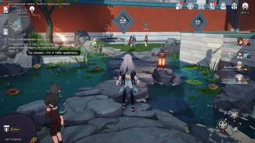 Телепортируйтесь к якорю «Земляная площадь» на Центральной гавани Приюта звездных яликов, а затем двигайтесь в южном направлении, чтобы пройти в сад, где вы встретите Март 7, Юньли и Яньцина. Поучаствуйте в их беседе. Ваша подруга захочет угостить учителей чаем перед началом обучения.