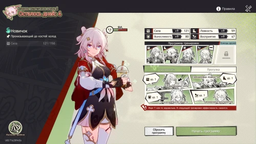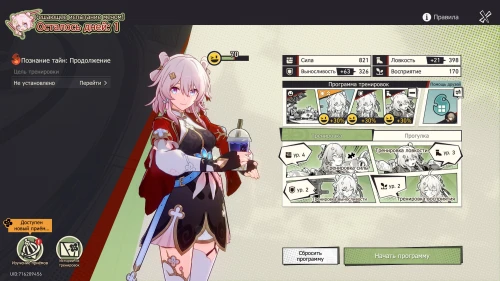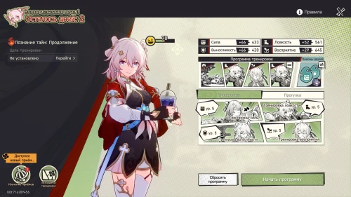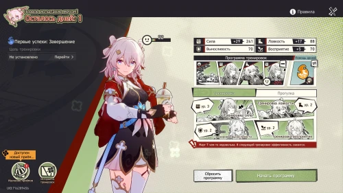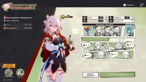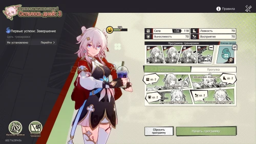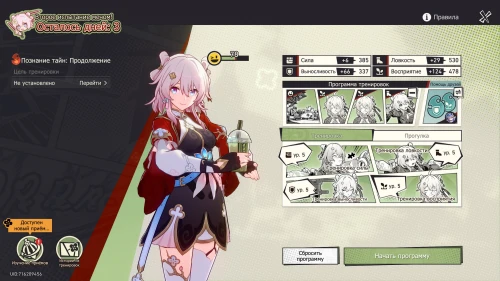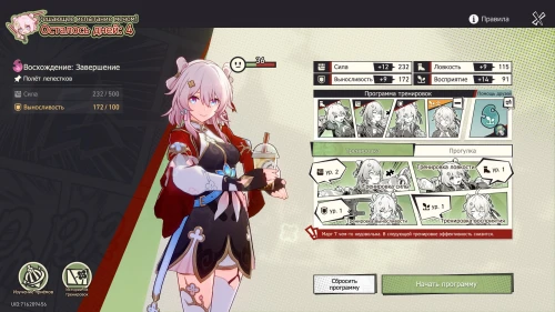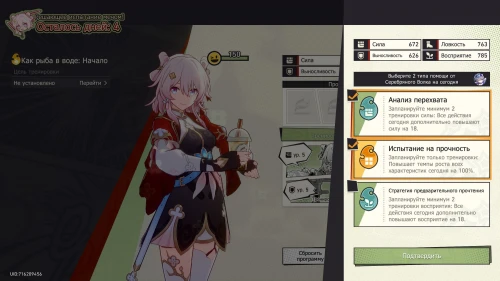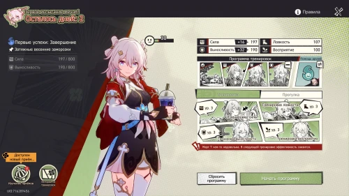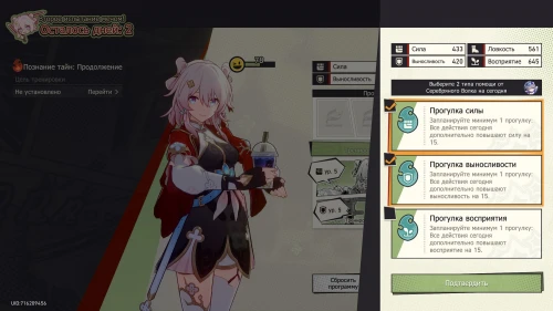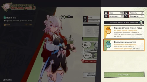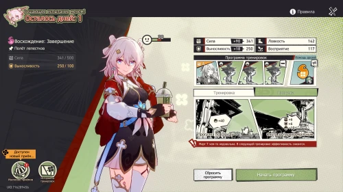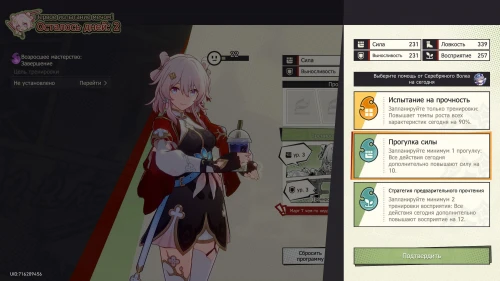 Сначала выберите 1 прогулку, чтобы восстановить настроение Март 7, а потом, если ваша сила ниже 100 единиц, то снова возьмите 2 тренировки Силы и 1 урок Ловкости. В ином случае нажмите на 1 тренировку Силы и 2 урока Ловкости.