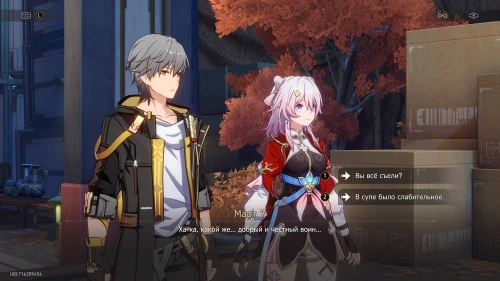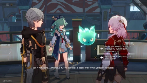 Начнется новая история, где вы вновь встретитесь с Цинцюэ. Опять же можете выбирать любые ответы, так как они ни на что не повлияют. В конце вы откроете новый бонус, повышающий рост характеристик, если настроение Март 7 выше 80.