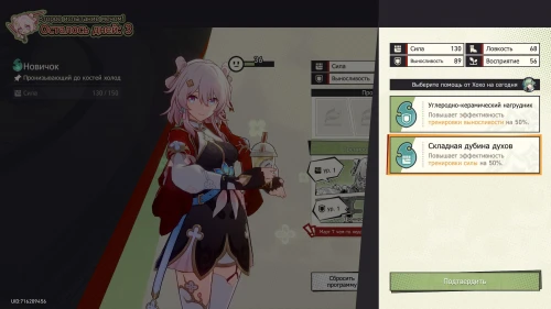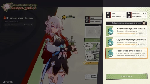 Выберите в качестве помощи от Цинцюэ «Незаметное отлынивание». Далее вновь возьмите 4 тренировки на Силу.