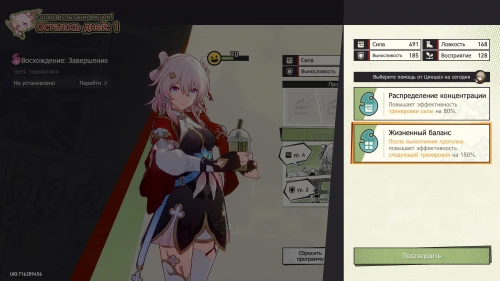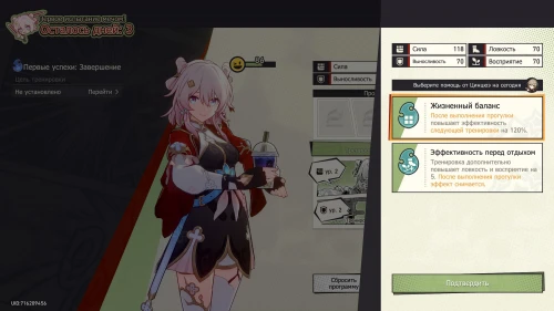 Выберите в качестве помощи от Цинцюэ «Жизненный баланс». Далее вам нужно будет достичь 500 единиц Силы, поэтому выбирайте столько тренировок, сколько вам необходимо для достижения соответствующего результат, однако первым делом выберите 1 Прогулку. В нашем случае нам было достаточно только 1 урока Силы. Мы также повысили Выносливость и Ловкость, которые пригодятся для некоторых приемов.