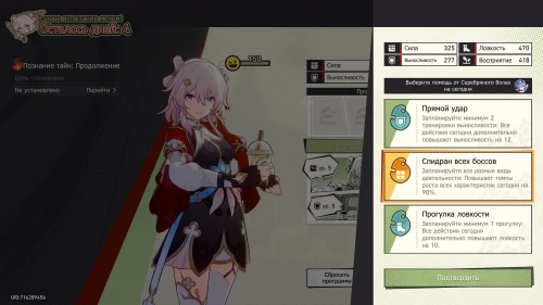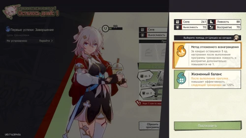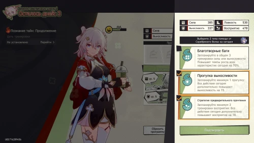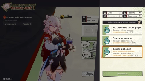 Выберите в качестве помощи от Цинцюэ «Метод отложенного вознаграждения». Далее выберите 3 тренировки на Силу, Ловкость и опять на Силу, как продемонстрированного на втором скриншоте ниже.