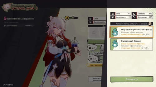 Выберите в качестве помощи от Цинцюэ «Обучение стрессоустойчивости». Далее возьмите 3 тренировки на Выносливость, а в конце – 1 Прогулку.