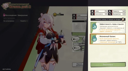 Выберите в качестве помощи от Цинцюэ «Жизненный баланс». Далее снова выберите 3 тренировки на Силу, а в конце – 1 Прогулку.