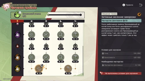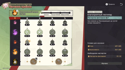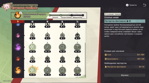 После взаимодействия с манекеном вы откроете главное меню события. Далее просто следуйте инструкциям, чтобы узнать, что первым делом вам нужно будет изучить «Пронизывающий до костей холод» (нажмите на иконку в левом верхнем углу, чтобы закрепить необходимый прием). Для этого вам понадобятся 150 единиц Силы и 2 Мастерства фехтования.