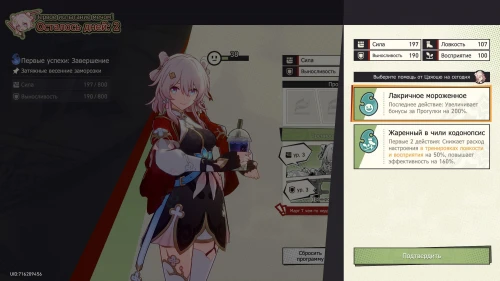 Выберите в качестве помощи от Цзяоцю «Жаренный в чили кодонопсис» и «Молочный коктейль с жемчугом». Дело в том, что мы уже повысили Силу и Выносливость до необходимых значений (800 единиц), поэтому решили увеличить Ловкость и Восприятие для открытия дополнительных приемов.