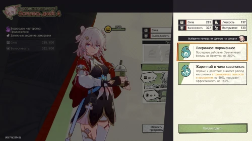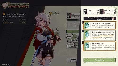 Выберите в качестве помощи от Цзяоцю «Лакричное мороженое» и «Фасолевый суп». Мы уже повысили Выносливость до нужного показателя (800 единиц), поэтому сейчас нацелились на Силу (вы же выберите ту характеристику, которую вам необходимо увеличить). В конце возьмите 1 Прогулку.
