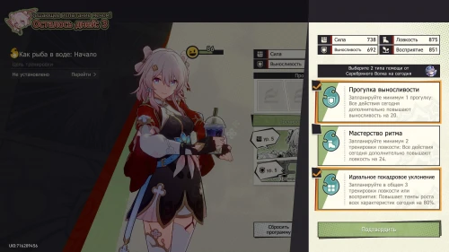 Став помощником Март 7, вам необходимо будет планировать для нее до 4-х разных тренировок на ежедневной основе, чтобы улучшить ее умения и создать базу для освоения новых приемов владения мечом.