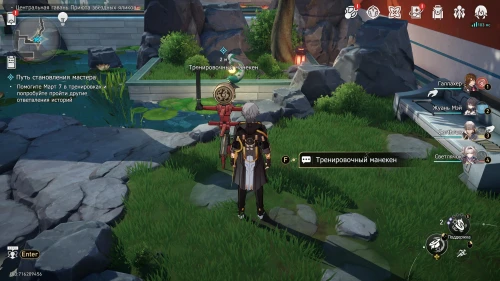 Затем поболтайте с Мэнмин и снова возвратитесь в сад. Здесь вы обнаружите тренировочный манекен. Взаимодействуйте с ним для начала испытаний.