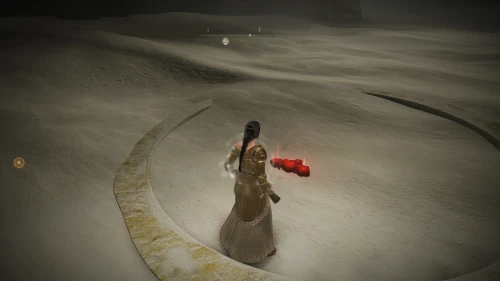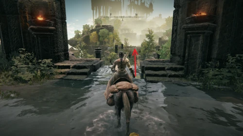 Рядом с этой точкой находится вход в руины. Следуйте внутрь и поднимитесь вверх по лестнице, где вскоре выйдете в большой зал с колоннами. Поверните налево и следуйте вперед прямо до подъемника, который выведет вас наружу.