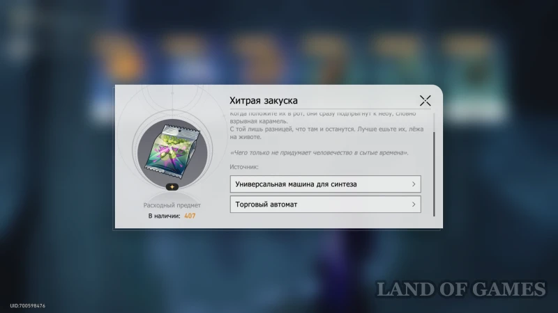Если у вас не хватает расходника «Хитрая закуска», который тюремные торговцы обменивают на свой ассортимент, перейдите в Синтез и создайте материал из Семян и Газообразной жидкости. Либо купите его в автомате с закусками на планете Ярило-VI: он стоит около отеля «Гете» в Административном районе Белобога.