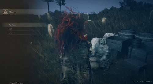 Впервые вы можете встретить этого торговца рядом с местом благодати «Крест у главных ворот», расположенным неподалеку от прохода в Белурат, поселение у башни. Пройти сюда можно практически в самом начале прохождения дополнения после попадания на Равнину Надгробий. Торговец будет сидеть рядом с коробками. Подробное прохождение его задания можно прочитать в отдельном гайде.