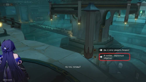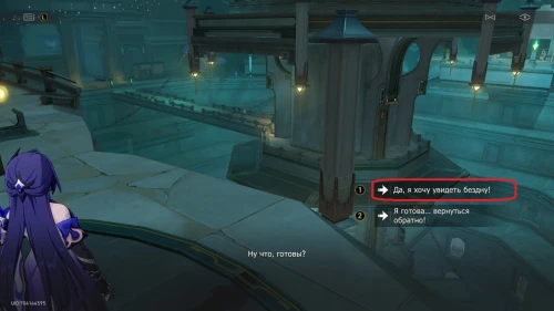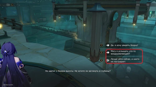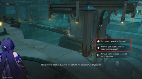 Подойдите к краю площадки и нажмите «Обзор». У вас будет три варианта ответа на предложение заглянуть в глубины: