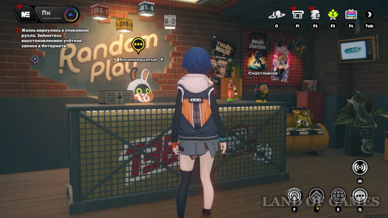Семейный видеопрокат имеет отдельное окошко среди доступных к быстрому перемещению локаций Нью-Эриду. Откройте общую карту (клавиша «M» на ПК) и выберите «Random Play», а затем переместитесь к прилавку на 1 этаже здания — так вы окажетесь перед рабочим местом Восемнадцатого, назначенного братом и сестрой банбу-продавца.