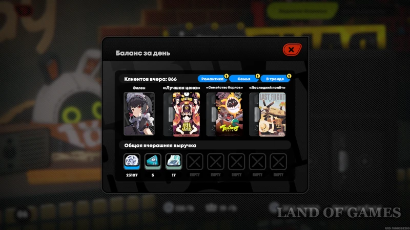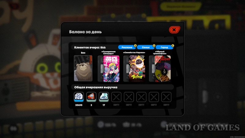 Перед началом каждого рабочего дня нам показывают статистику по предыдущему: количество покупателей и общую выручку. Помимо заработанных денни, в зависимости от выбранного промоутера, среди наград могут быть: