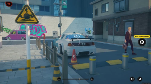 Переместитесь к мастерской «Турбо» на Шестой улице, и прямо возле нее вы обнаружите Энцо – пообщайтесь с ним и попросите разрешение сделать его снимок. Достаньте фотокамеру (зажмите клавишу «F», а потом нажмите на иконку объектива), наведите ее на мужчину и сфотографируйте его после появления желтой надписи «Цель обнаружена».