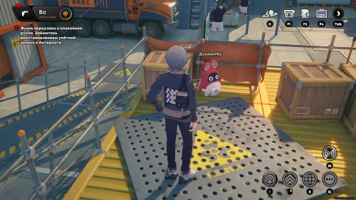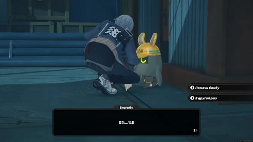 Вернитесь к инспектору Мяучело, а затем начните бежать вперед к желтому экскаватору впереди. Пройдя мимо стальных балок, поверните вправо и подойдите к желтому банбу по имени Альфабу. Предложите ему свою помощь для начала решения головоломки.