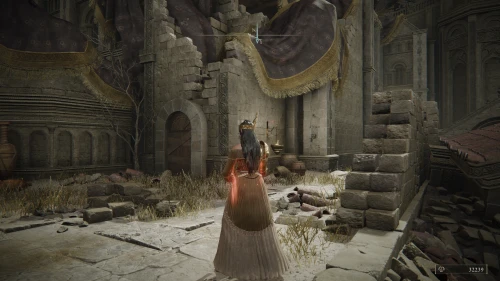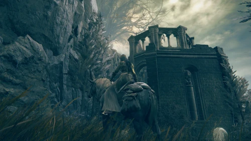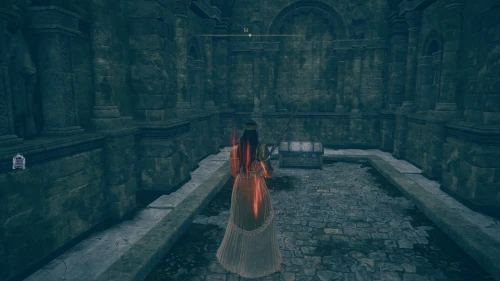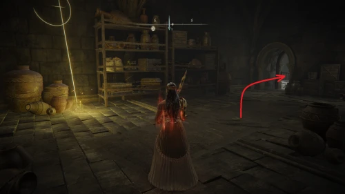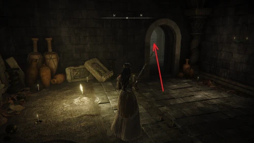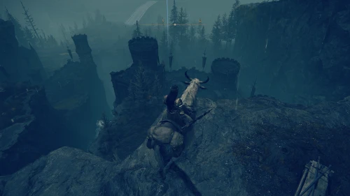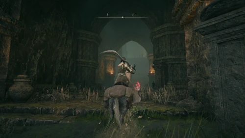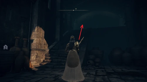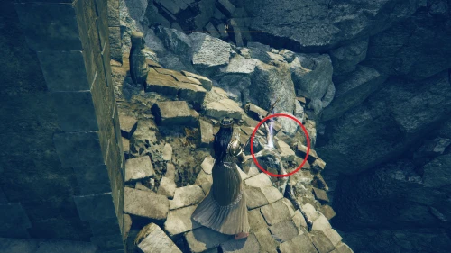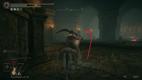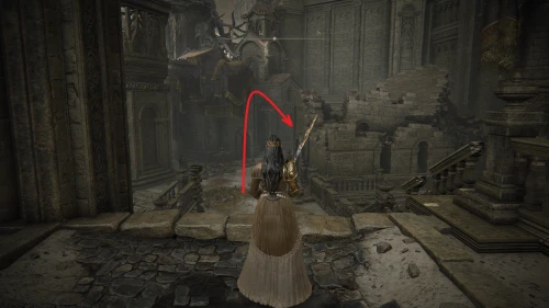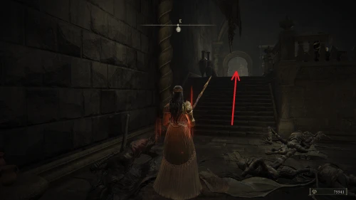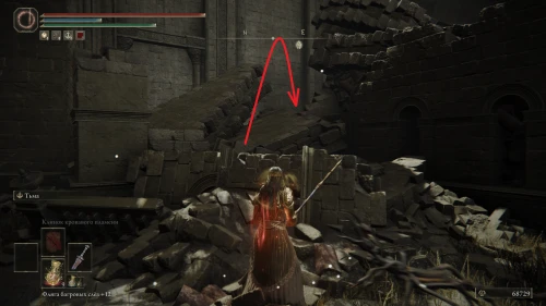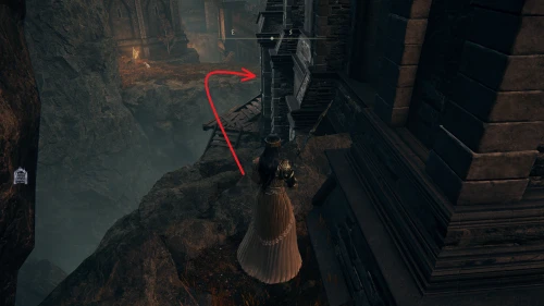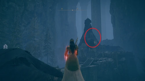 От точки «Руины обители Рауха, запад», войдите в руины и поднимитесь по лестнице в колонный зал. Поверните налево и поднимитесь вверх на подъемнике.