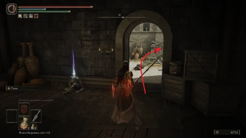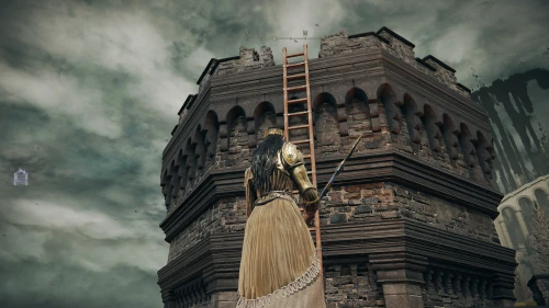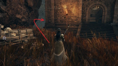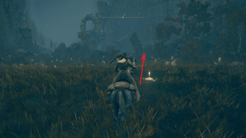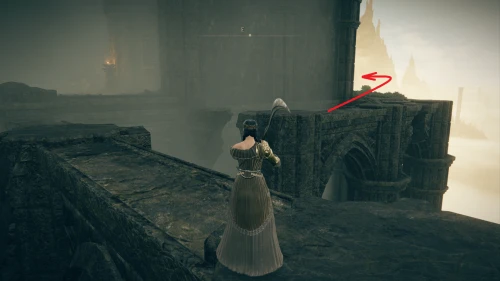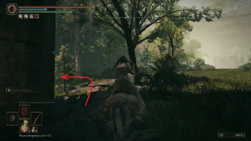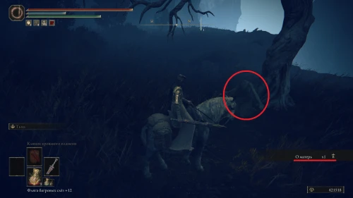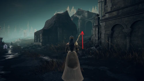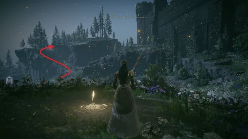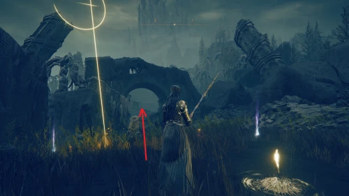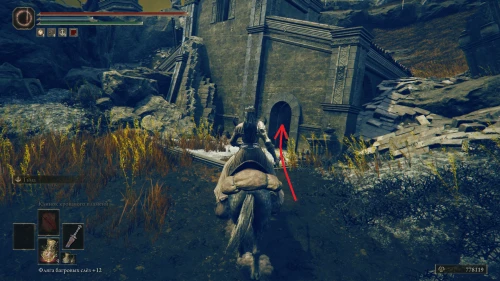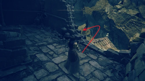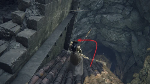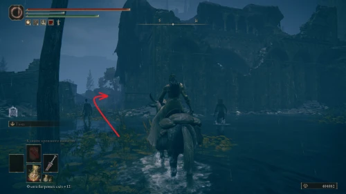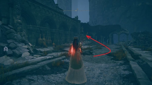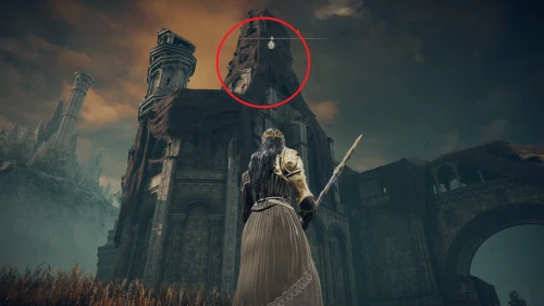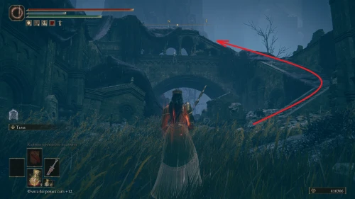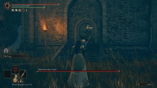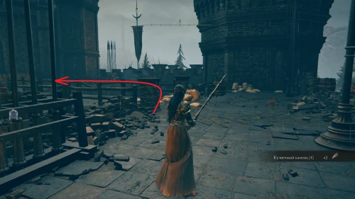 Следуйте по локации вперед до второй башни, где вас встретит босс Черный рыцарь Гэрью. Чтобы добраться до сундука с талисманом Разящего наконечника, необходимо пройти за эту башню, подняться по деревянной лестнице и забраться прямо на самый верх.