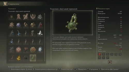 Талисман с Двухглавой черепахой является улучшенным вариантом обычного Талисмана Зеленой черепахи. Они оба ускоряют восстановление выносливости, но Двухглавая черепаха делает это практически мгновенно (на 10 единиц в секунду).