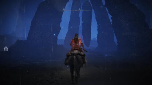 От точки «Последний привал у горной дороги», скачите на юго-восток до конца локации, пока не упретесь в скалы. Подниматься по ним не нужно, просто обойдите их с правой стороны по тропинке у обрыва. Будьте осторожны: на выходе к территории Храма вас будет поджидать Проклятый клинок.