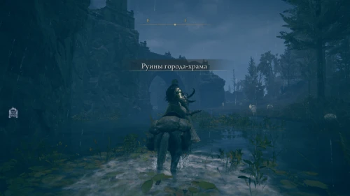 От точки «Руины города храма», скачите на юго-восток и зайдите в руины. Необходимо попасть внутрь здания с большой башней, находящегося на юго-западе. Для этого обойдите его и с южной стороны найдите трещину в стене. Поднимитесь на самый верх здания, и в башне вы найдете сундук с Талисманом Двуручного меча.