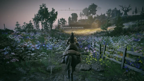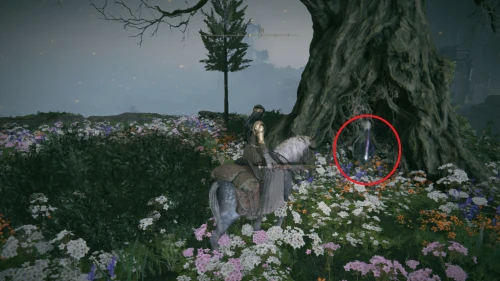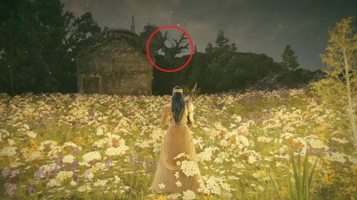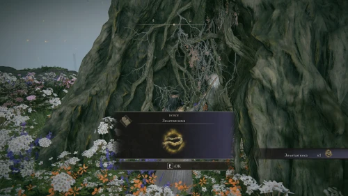 Проследуйте вверх по дороге, пока не выйдете на цветочное поле необходимой нам локации. Уже с середины поля будет видно дерево, под которым находится Золотая коса.