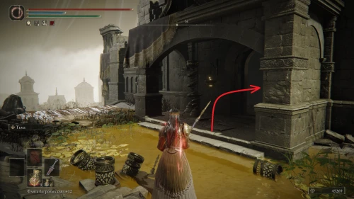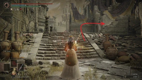 От точки телепорта «Руины Мурта» пройдите через стоящую впереди арку и зайдите в первое полуразрушенное помещение. Зайдите в него и поверните за угол как показано на скриншотах. Там вы найдете труп с нужным талисманом.