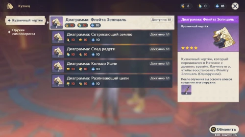 Теперь вступите в диалог с хозяином мастерской и выберите опцию «Я хочу купить оружие». В разделе «Кузнечный чертеж» вы сможете приобрести различные рецепты крафтового вооружения, потратив определенное количество следующих ресурсов (их расположение можно посмотреть на интерактивной карте Натлана):