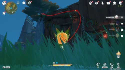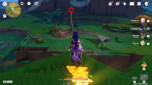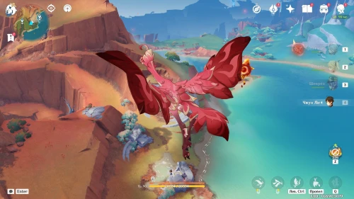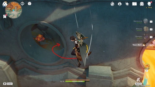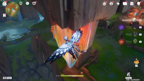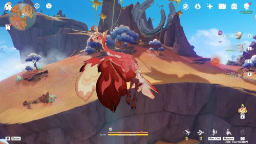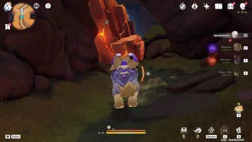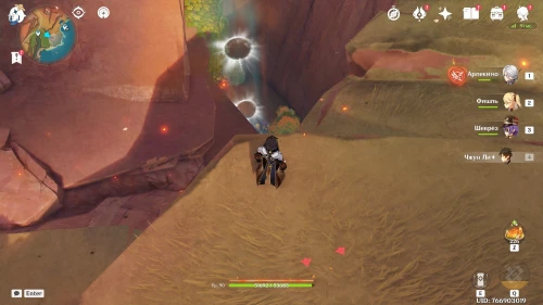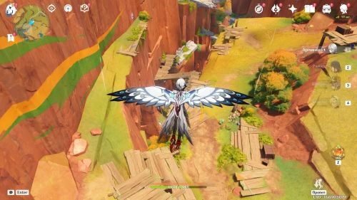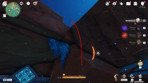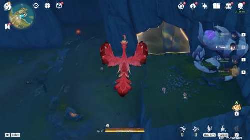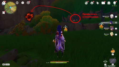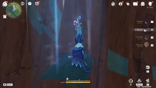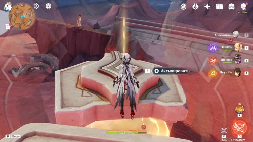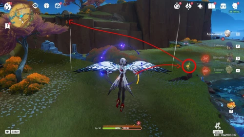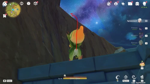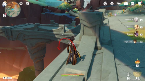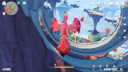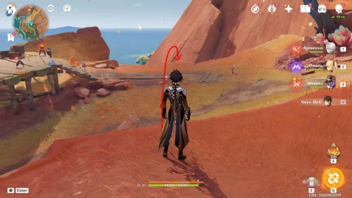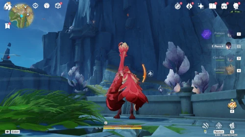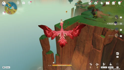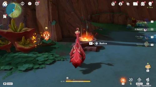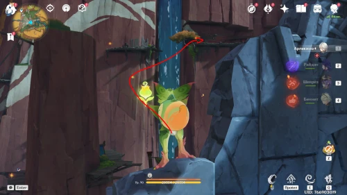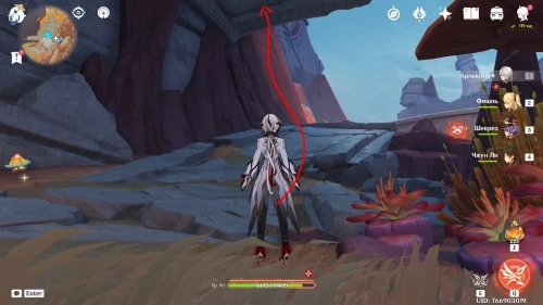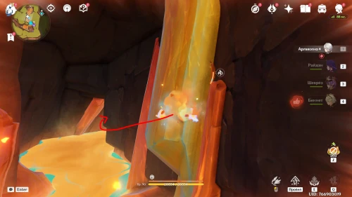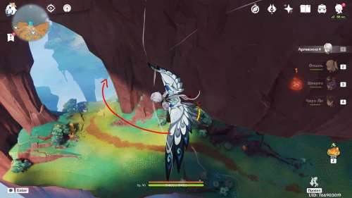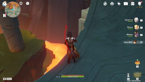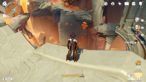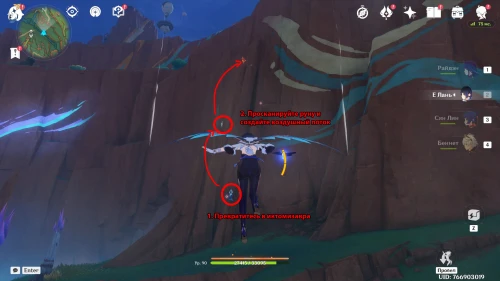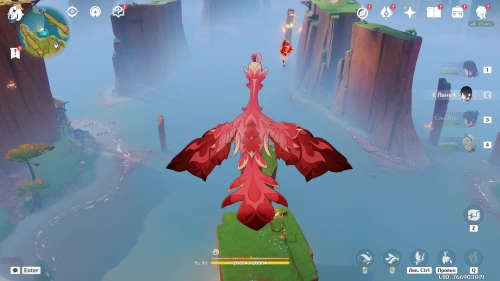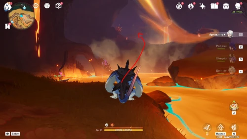 Телепортируйтесь к статуе Пиро Архонта в указанной области, а затем развернитесь, превратитесь в тепетлизавра (клавиша Т) и войдите в трещину в скале, чтобы подняться на самый вверх. Далее вернитесь в свою обычную форму и спланируйте на противоположный утес. Там вы увидите каменный выступ, на вершине которого и расположился окул.