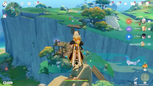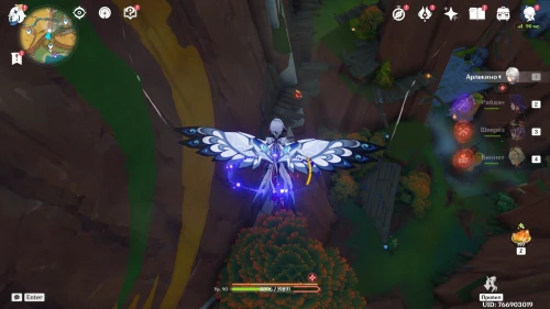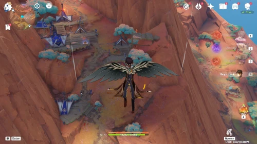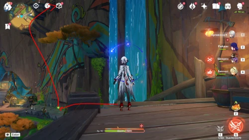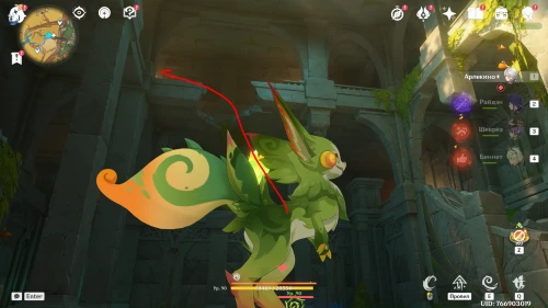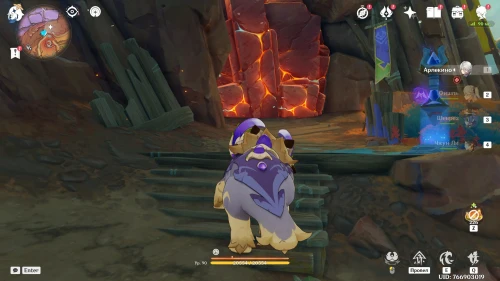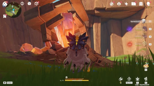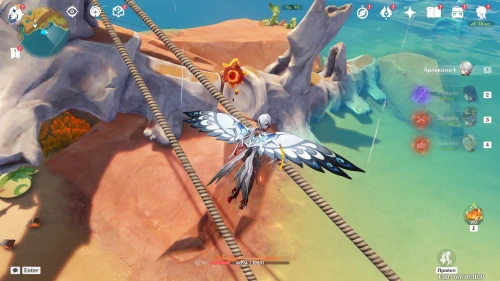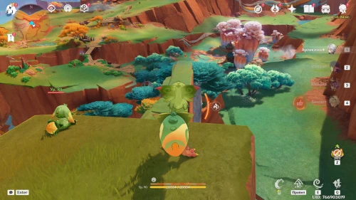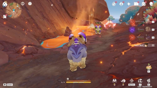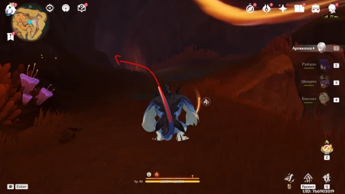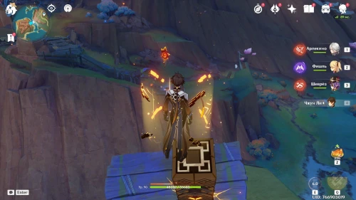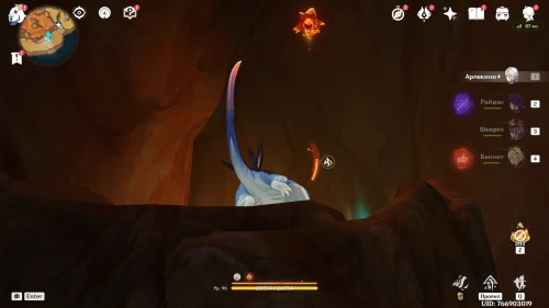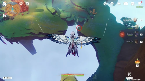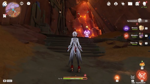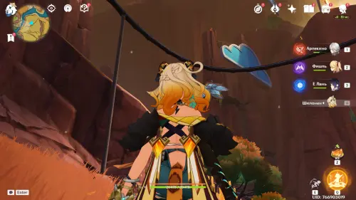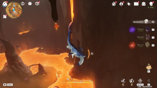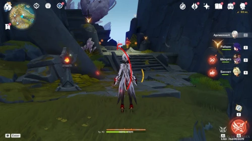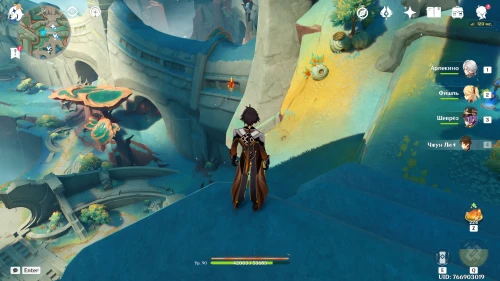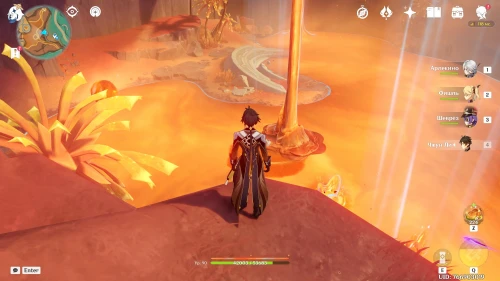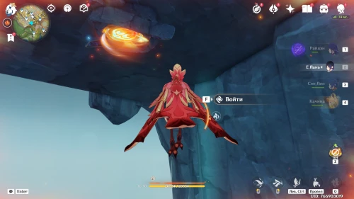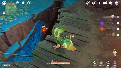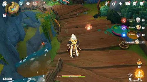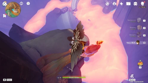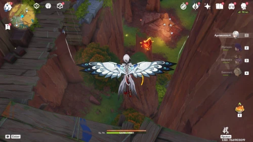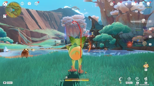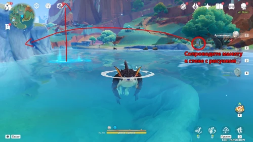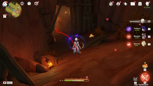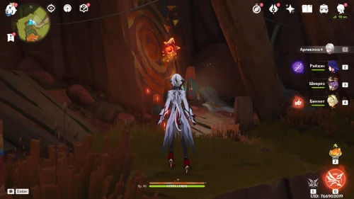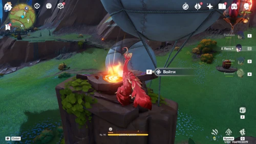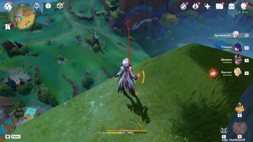 Телепортируйтесь к статуе Пиро Архонта в указанной области, а затем развернитесь, превратитесь в тепетлизавра (клавиша Т) и войдите в трещину в скале, чтобы подняться на самый вверх. Далее вернитесь в свою обычную форму и спланируйте на противоположный утес. Там вы увидите каменный выступ, на вершине которого и расположился окул.