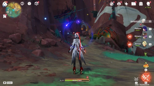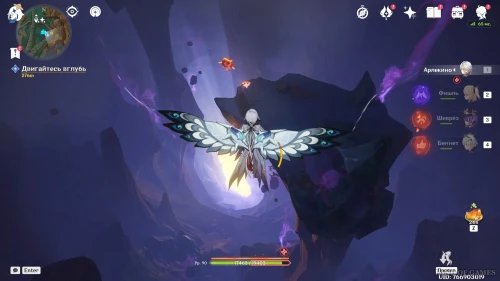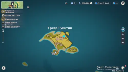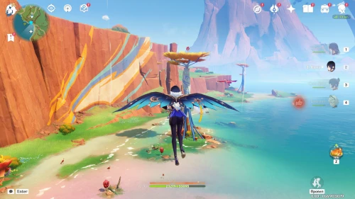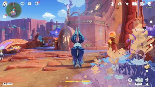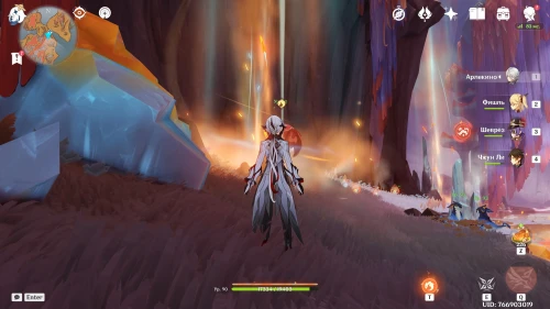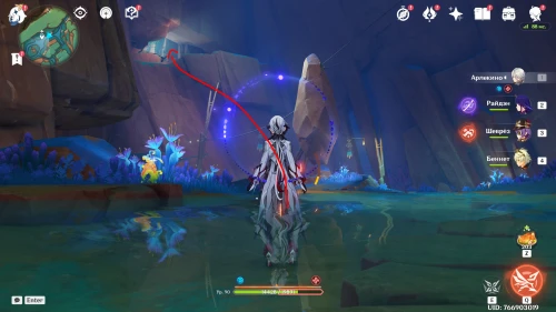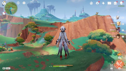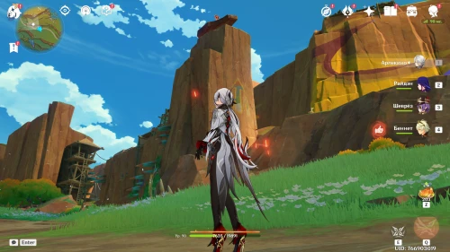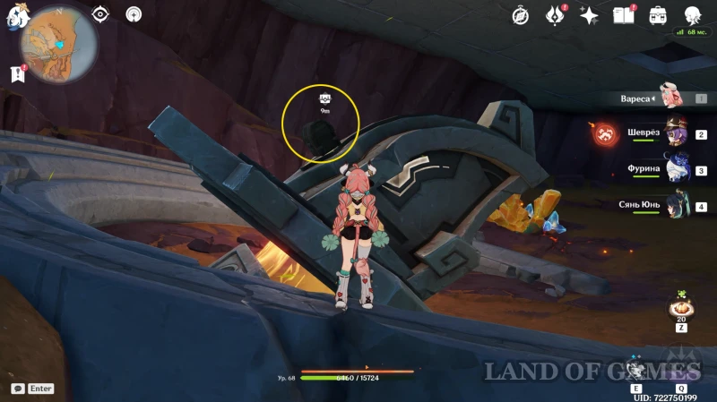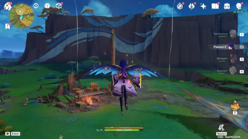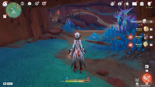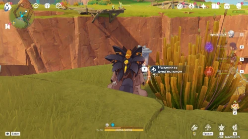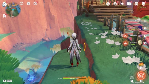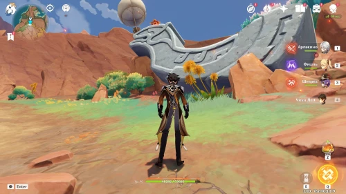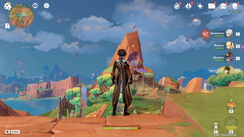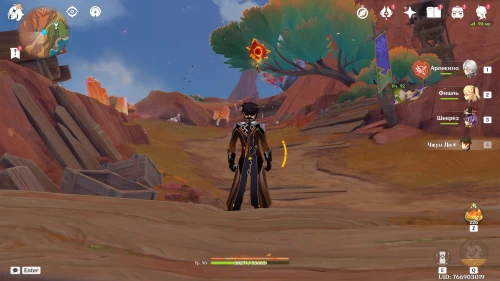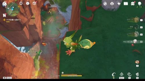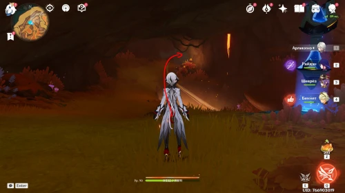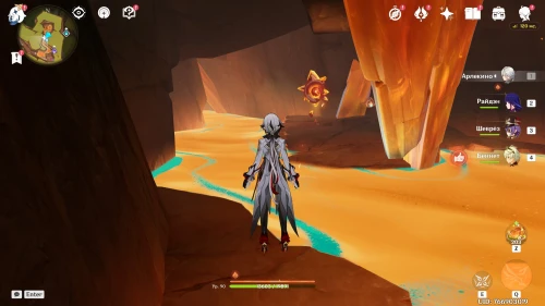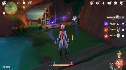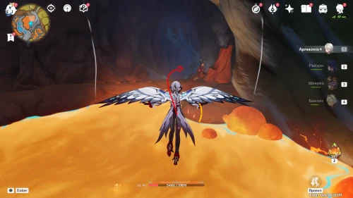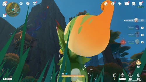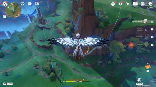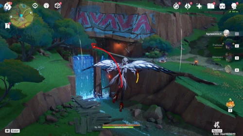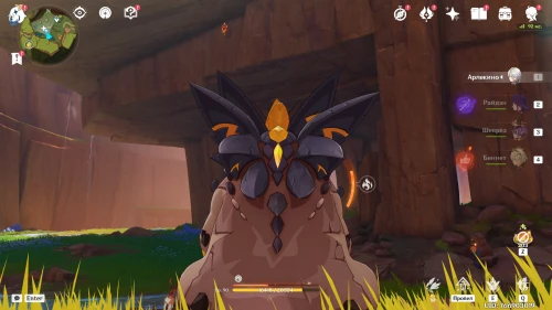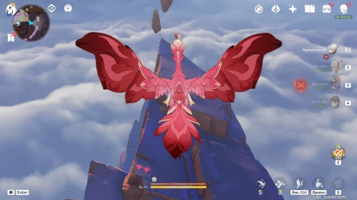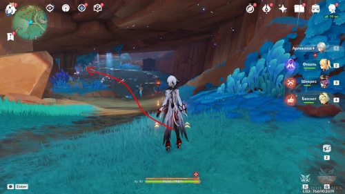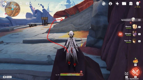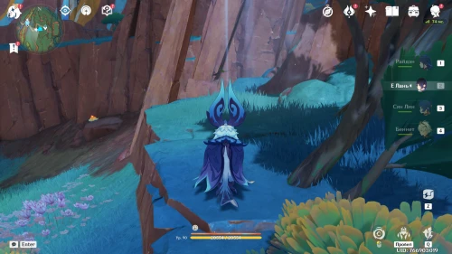 Телепортируйтесь к статуе Пиро Архонта в указанной области, а затем развернитесь, превратитесь в тепетлизавра (клавиша Т) и войдите в трещину в скале, чтобы подняться на самый вверх. Далее вернитесь в свою обычную форму и спланируйте на противоположный утес. Там вы увидите каменный выступ, на вершине которого и расположился окул.