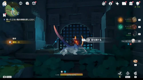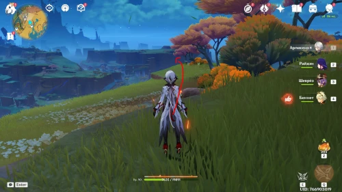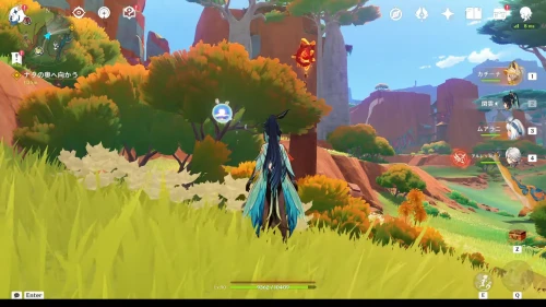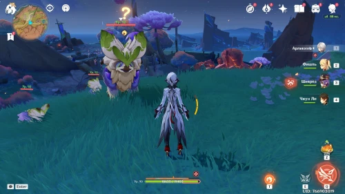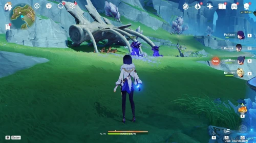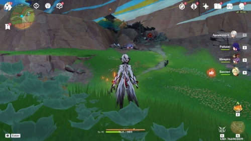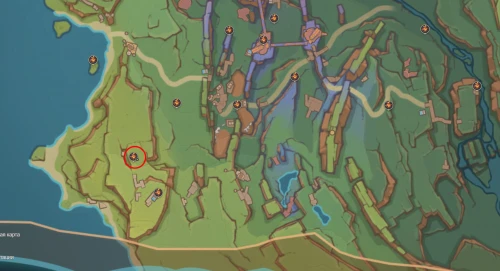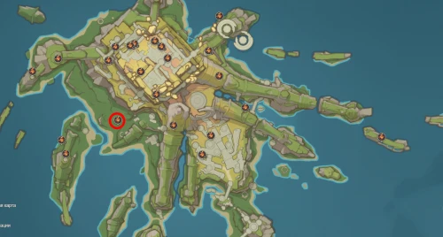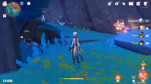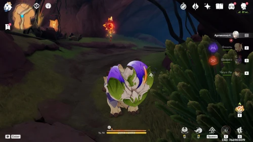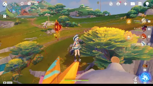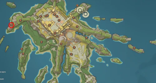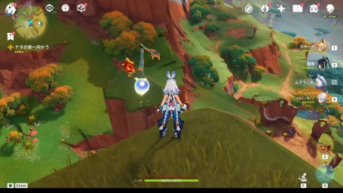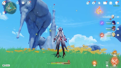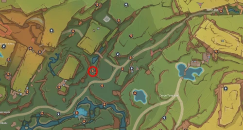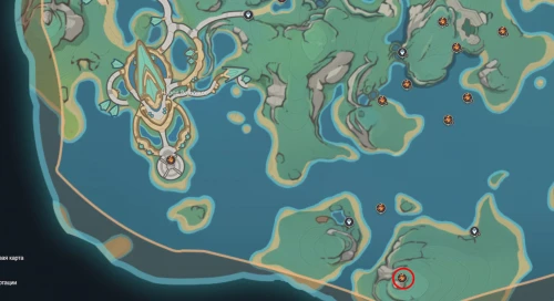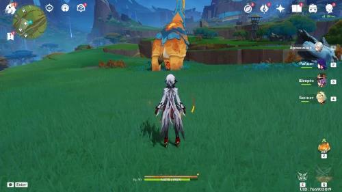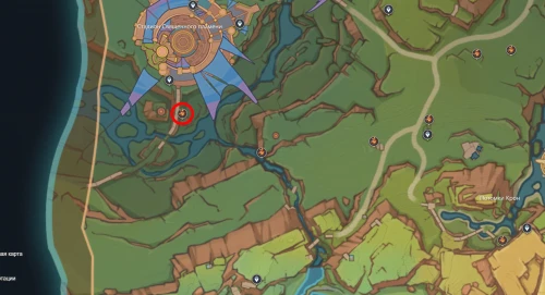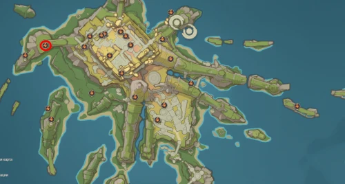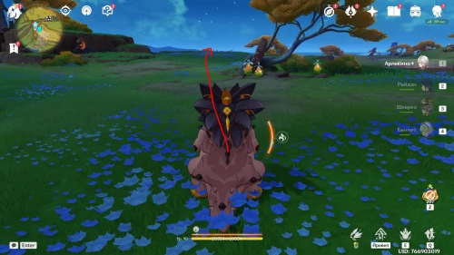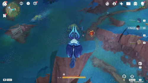 Телепортируйтесь к статуе Пиро Архонта в указанной области, а затем спланируйте вниз в юго-западном направлении на утес с гигантскими заврианами. Под ногами одного из длинношеих существ вы обнаружите очередной окул.