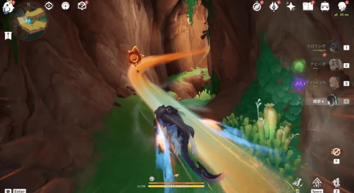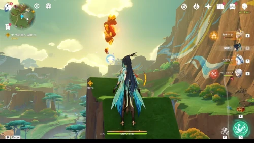 Снова переместитесь к статуе Пиро Архонта, а затем, как и в случае с 26-м пирокулов, заберитесь наверх с помощью тепетлизавра. Забравшись наверх, двигайтесь по плато на восток, а потом спрыгните вниз в отмеченном месте и подберите частицу, висящую над каменным выступом.
