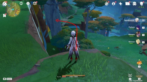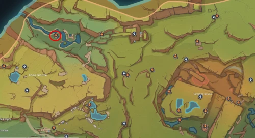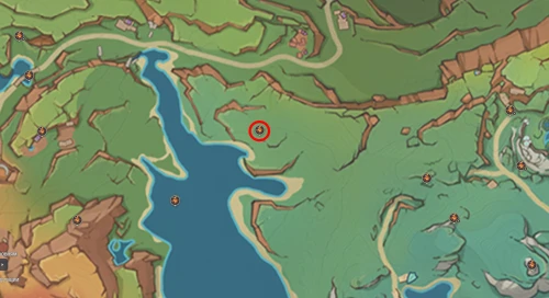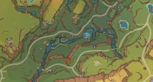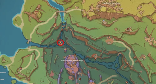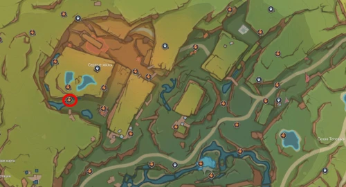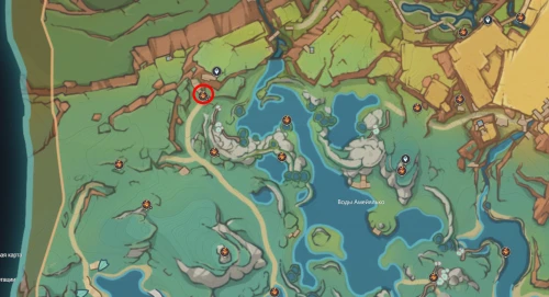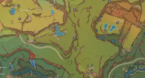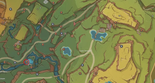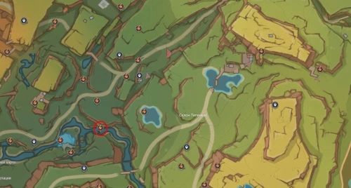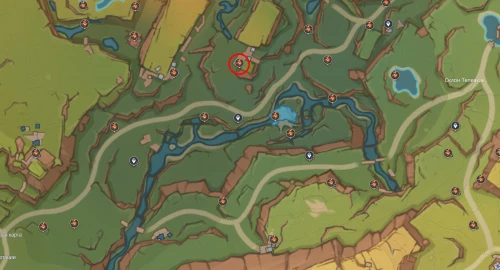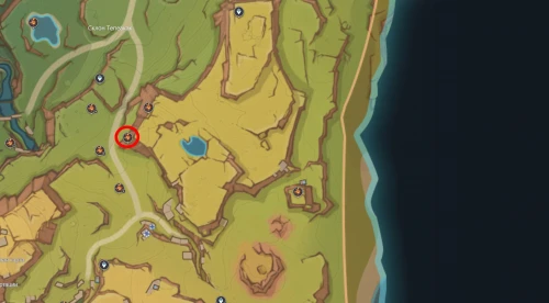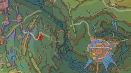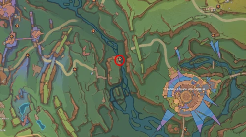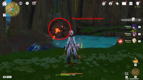 Переместитесь к юго-восточному телепорту области, а затем бегите к водоему на западе. Поднимитесь чуть выше водопада, и возле подножья скалы вы обнаружите глыбу камней с красными прожилками. Уничтожьте ее любыми атаками (быстрее всего работает двуручник и Гео удары). За ней вы обнаружите окул.