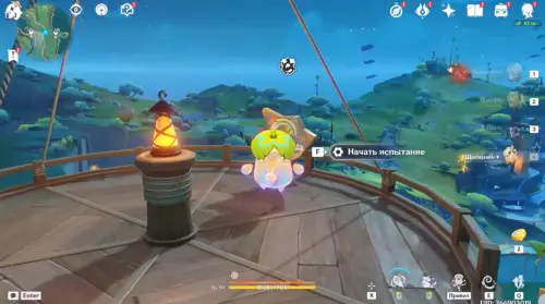 Теперь подойдите к деревянной табличке и начните испытание. В рамках него вам нужно будет собирать красные сферы, стреляя в цветочные платформы, а затем притягиваясь к ним с помощью навыка аши. В конце данного челленджа вы сможете подняться на нужную высоту и схватить пирокул. Весь процесс продемонстрирован на видео ниже.