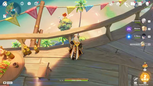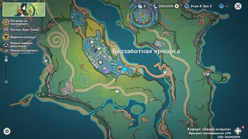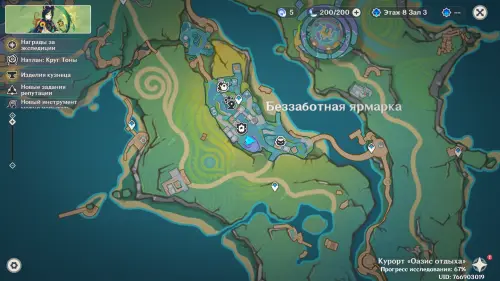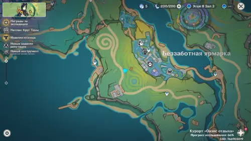 Переместитесь к телепорту, расположенному к востоку от Беззаботной ярмарки, а затем начните двигаться на северо-запад к домикам, стоящим впереди. По пути превратитесь в ашу. Приблизившись к домам, заберитесь на один из них с помощью навыка аши, а потом перелетите на пальму справа и схватите окул.