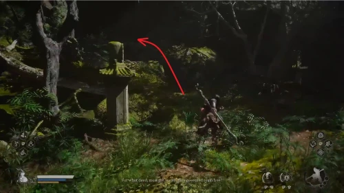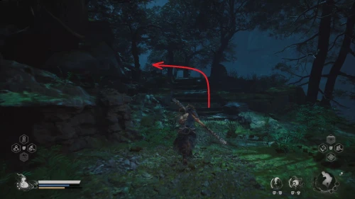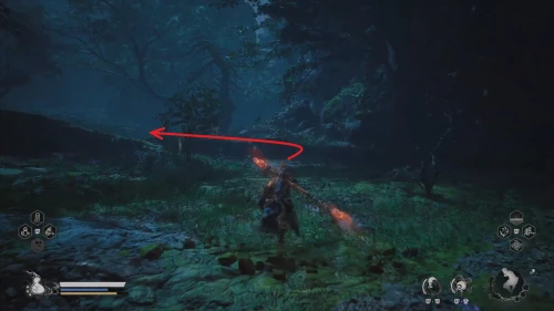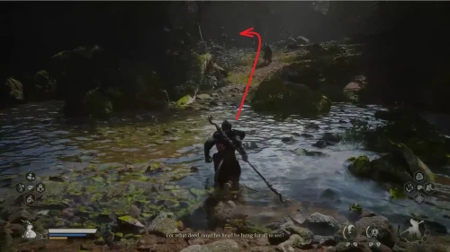 Чтобы найти и убить первого босса, вернитесь в первую главу, локацию Волчий лес, алтарь Лес снаружи. От алтаря идите вперед и поверните влево на первом повороте. Затем поверните направо и двигайтесь вперед. У каменного столба с письменами сверните на тропинку, ведущую вниз, к реке.
