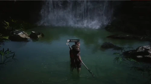 Перейдите через реку, сверните налево у следующего каменного столба, и двигайтесь вперед, пока не выйдете в озеро с нужным водопадом.
