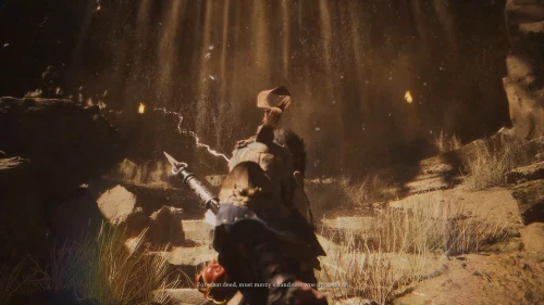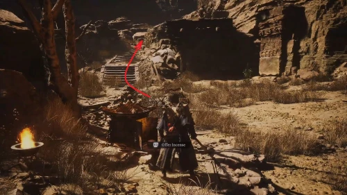 От алтаря Долина отчаяния в локации Деревня песчаные врата, поверните в ближайшую рядом с вами пещеру. Дойдя до просторного помещения с горящим факелом, сразу сверните налево и спрыгните вниз. Развернитесь к скале, с которой вы спрыгнули, и перед вами окажется стена с барельефами, которую необходимо сломать. Там же вам необходимо будет драться с боссом — Первым принцем текучих песков.