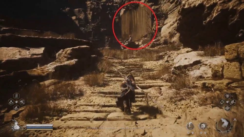 Следующего уникального босса можно найти совсем недалеко от сохранения Каменная равнина в локации Скала страха. Взберитесь по лестнице на самый верх, где сразу будет видно песчаный водопад. Аналогично прошлому водопаду, откройте проход с помощью Чешуек и сразитесь с Черным луном.