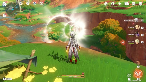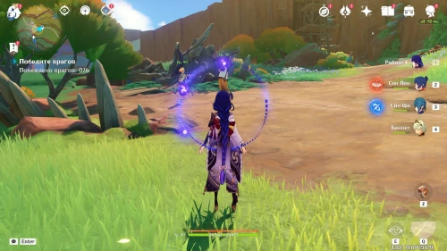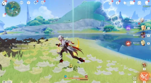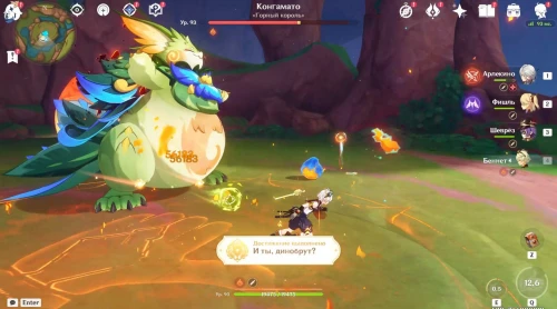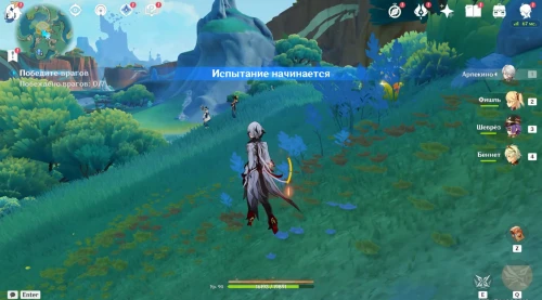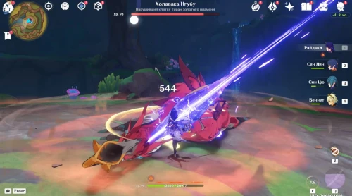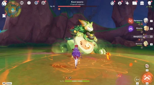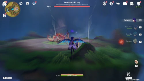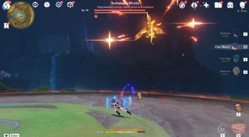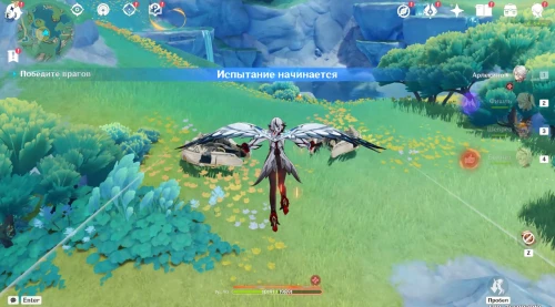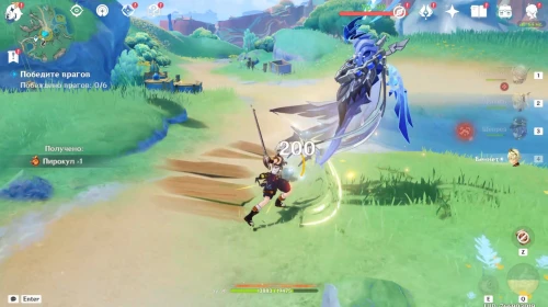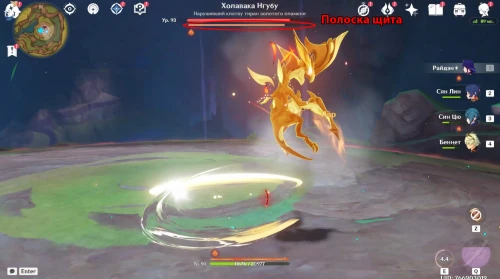 Если же у вас получится уничтожить сферу, то босс приземлится на землю, и вы сможете достать его даже героями ближнего боя. Тут же начните атаковать его Гидро стихией (подойдут и другие элементы за исключением Пиро), дабы поскорее разрушить его щит (оранжевая полоска под шкалой здоровья). Уничтожив его, вы повалите дракона на землю и выполните условие. Плюс, у вас откроется достижение «Черная стрела охотника на заврианов».
