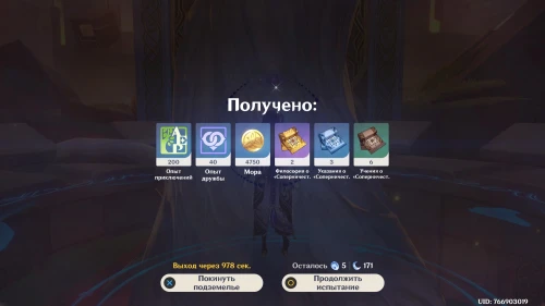 - Награда: 100 очков приключений, 2375 мора, 20 очков дружбы, 2-звездочный, 3-звездочный и 4-звездочный материалы для повышения навыков (ежедневная ротация, рассмотрена чуть ниже).